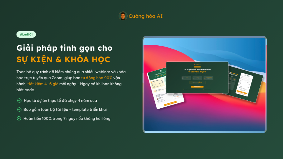 Toàn bộ quy trình đã kiểm chứng qua nhiều webinar và khóa học trực tuyến qua Zoom, giúp bạn tự động hóa 90% vận hành, tiết kiệm 4-6 giờ mỗi ngày - Ngay cả khi bạn không biết code.